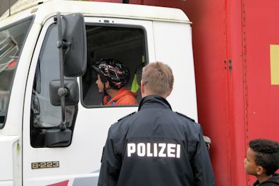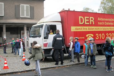 Der Polizist Herr Grünvogel leitete die Station „Toter Winkel“. Ein Schüler hat sich in den LKW gesetzt und die anderen Kinder haben Hütchen aufgestellt. Derjenige im LKW sollte dann schauen, ob es die Hütchen in den Spiegeln oder durch das Fenster noch sehen kann. Der Tote Winkel ist ein Bereich, den der Fahrer nicht sehen kann. Befindet sich in diesem Bereich ein Fahrradfahrer, ist das sehr gefährlich!