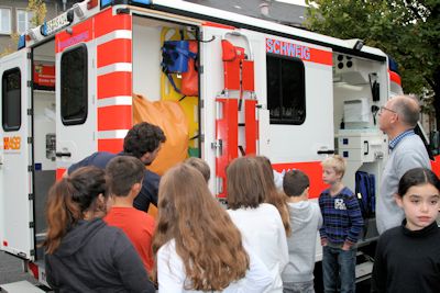 Außerdem hat uns ein Sanitäter den Krankenwagen gezeigt. Es gibt z.B. Medikamente, eine Versorgungstasche speziell für Kinder, Sauerstoffgeräte, ein Schockgerät, Spritzen, Konserven und Atemmasken. Das Blaulicht wurde auch einmal extra für uns angemacht!