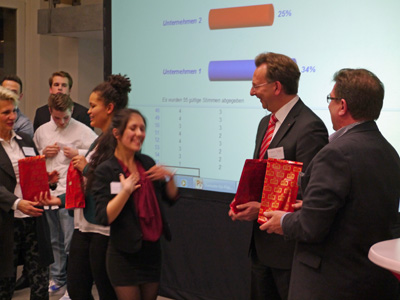 Der unterhaltsame Höhepunkt der Woche stand am Donnerstagabend auf dem Programm: Alle drei Unternehmen präsentierten vor Vertreter/innen der Braunschweiger Wirtschaft in Konkurrenz zueinander ihr neuestes Produkt. Das Publikum agierte in diesem Spiel als Einkäufer, es musste also ein Entscheidung zwischen den drei hervorragenden Angeboten treffen – die Qual der Wahl.