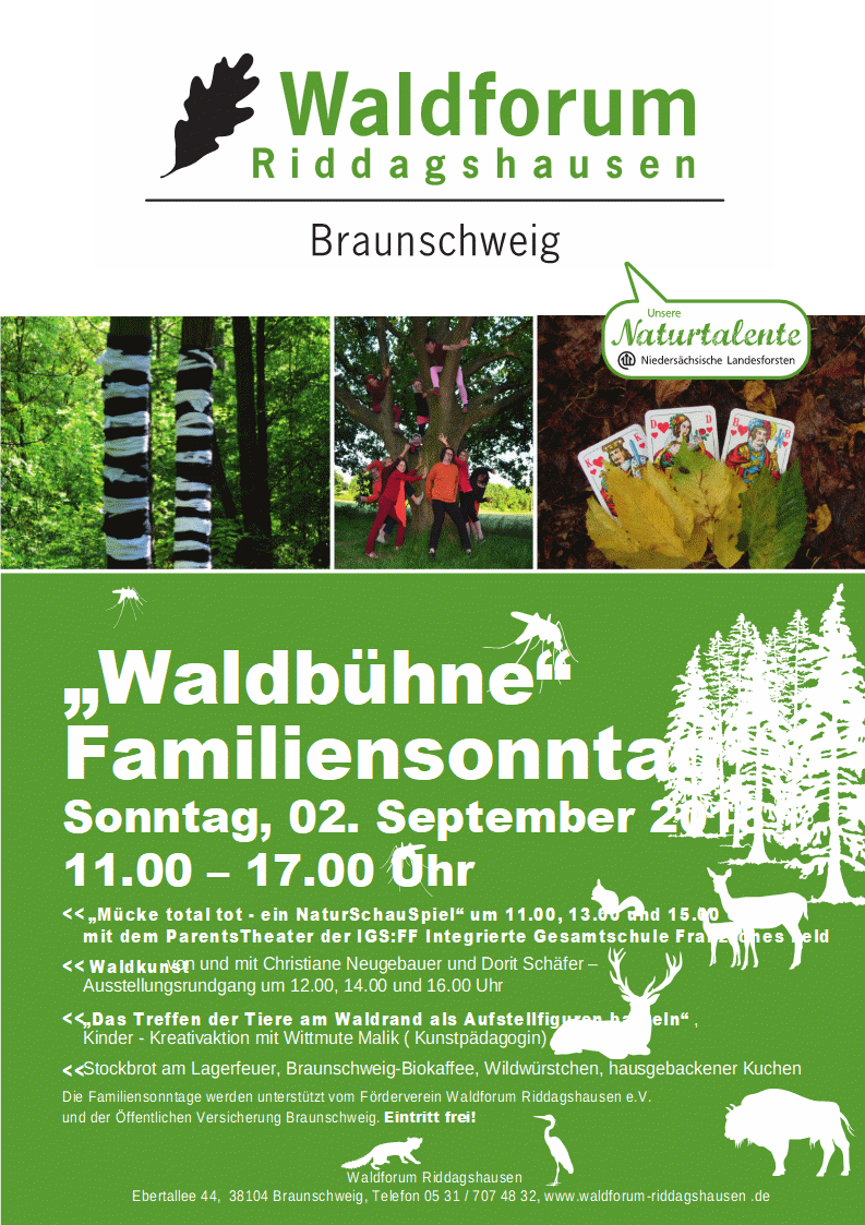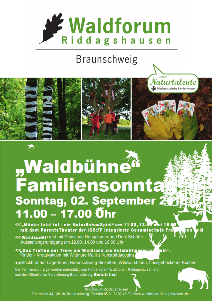 Im Rahmen des Familiensonntags „Waldbühne“ des Waldforums Riddagshausen führen die Eltern das eigens dafür Produzierte Stück „Mücke total tot – eine NaturSchauSpiel“ jeweils um 11.00, 13.00 und 15.00 Uhr auf.